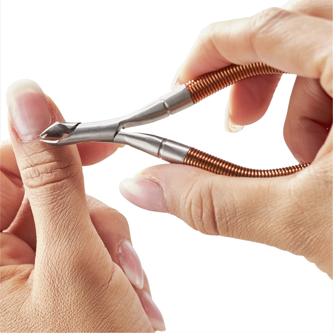 Grip & Snip Spiral Spring Cuticle Nipper features a unique coil handle for a secure, non-slip grip and ergonomic comfort. The sharp tip allows precise cuticle trimming, while the spring design ensures smooth, controlled cutting. Made of durable stainless steel.